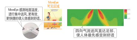Move Move Eye動(dòng)態(tài)地面測(cè)溫技術(shù)即通過追加動(dòng)態(tài)地面測(cè)溫組件,使機(jī)組可以通過紅外輻射感應(yīng)地面溫度,自動(dòng)調(diào)節(jié)送風(fēng),防止過冷/過熱,提升舒適感的同時(shí)有效杜絕了能量浪費(fèi) 天花型卡式四向送風(fēng)內(nèi)機(jī)MoveEye可實(shí)現(xiàn)360°范圍地面測(cè)溫